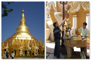 ミャンマー最大の聖地シュエダゴン・パゴダなどでは、仏塔の周囲に各曜日の祭壇が設置されています。自分の曜日の祭壇へ行き、自分の年齢の数(あるいは+1回)だけ、守護動物や仏像に水をかけるのが代表的なお参りの方法です。